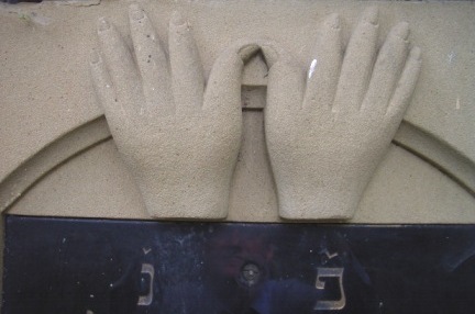Grabstein auf dem Schweinfurter Hauptfriedhof: Segnende "Priester"-Hände, die in der Synagoge den Aaronidischen-Segen (4. Mose 6,24-26) spenden.